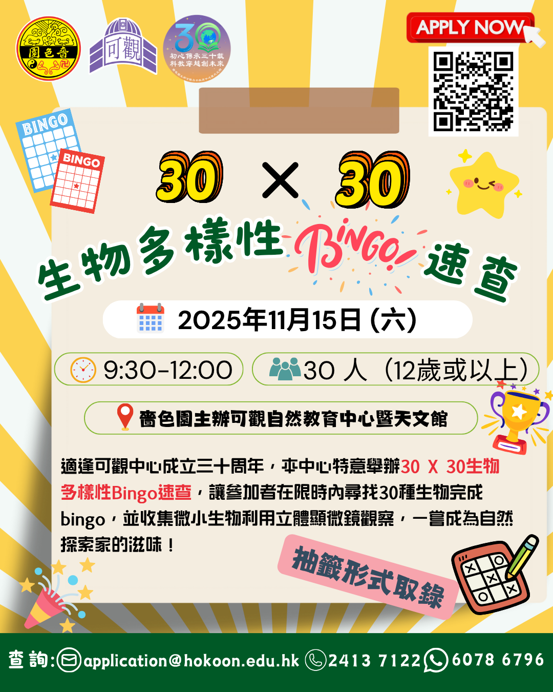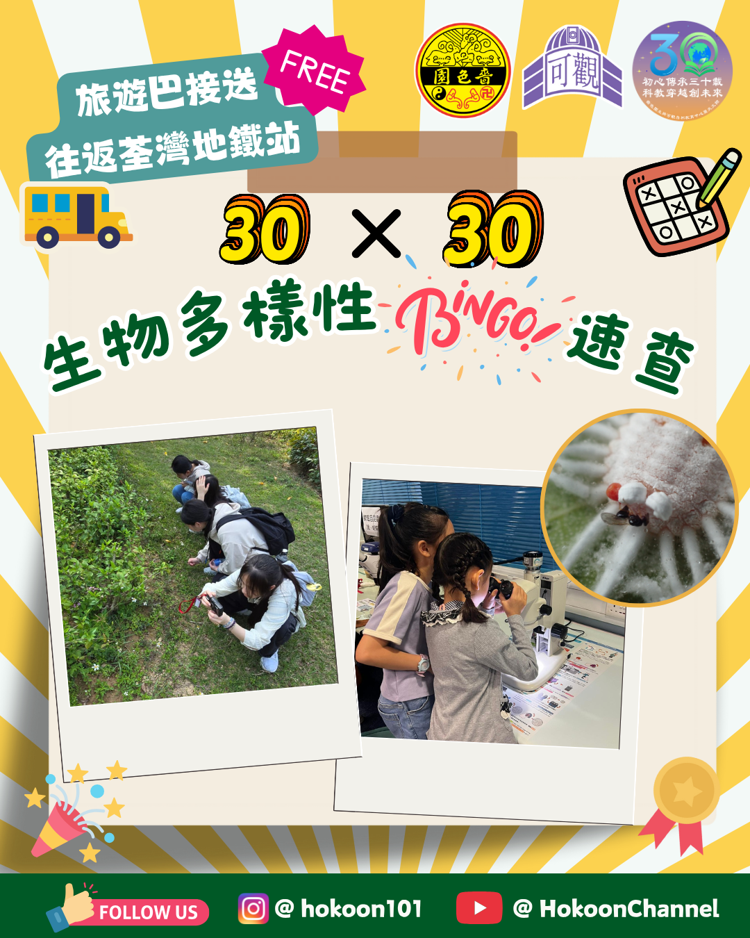 適逢可觀中心成立三十周年,本中心特意舉辦30 X 30生物多樣性Bingo速查,讓參加者在限時內尋找30種生物完成bingo,並收集微小生物利用立體顯微鏡觀察,一嘗成為自然探索家的滋味!