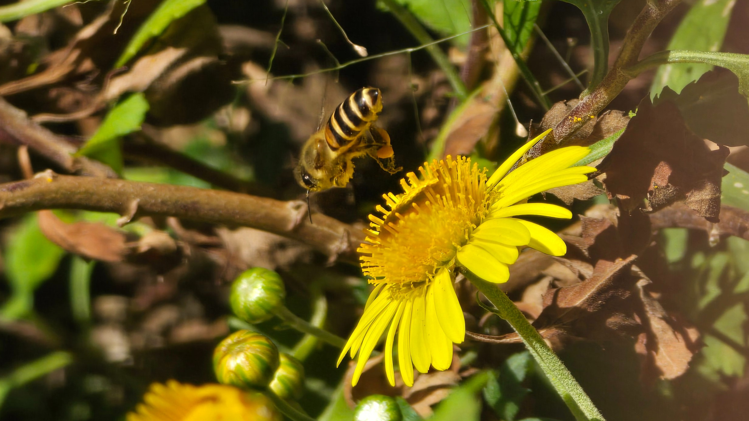 盛放的野菊吸引了不少蜜蜂前來訪花。比起花蜜,或許花粉對牠們更具吸引力。筆者觀察時常見蜜蜂訪花後,腳上的花粉籃載滿了橙黃色的花粉 – 那是牠們重要的蛋白質來源,用以哺育幼蜂,對維持整個蜂群的生存至關重要。而在採集過程中,蜜蜂身上掉落的花粉也悄然為野菊完成了授粉,互利共生。