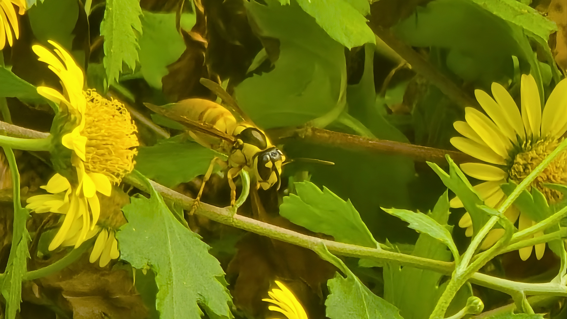 野菊的綻放,也牽起了其他生命的相遇:以蚜蟲、薊馬、粉蝨為食的六斑月瓢蟲在花間來回巡弋,靜靜覓食;企圖捕獵蜜蜂的雙色胡蜂在花叢中頻頻穿梭,雖屢試未成,卻為這片花坡添上幾分生動的趣味。