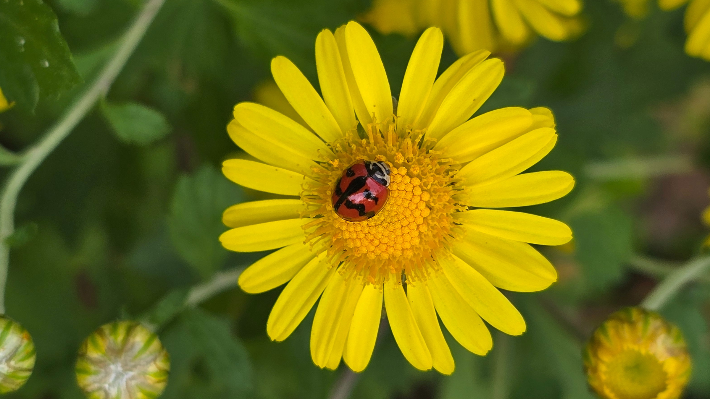 野菊的綻放,也牽起了其他生命的相遇:以蚜蟲、薊馬、粉蝨為食的六斑月瓢蟲在花間來回巡弋,靜靜覓食;企圖捕獵蜜蜂的雙色胡蜂在花叢中頻頻穿梭,雖屢試未成,卻為這片花坡添上幾分生動的趣味。