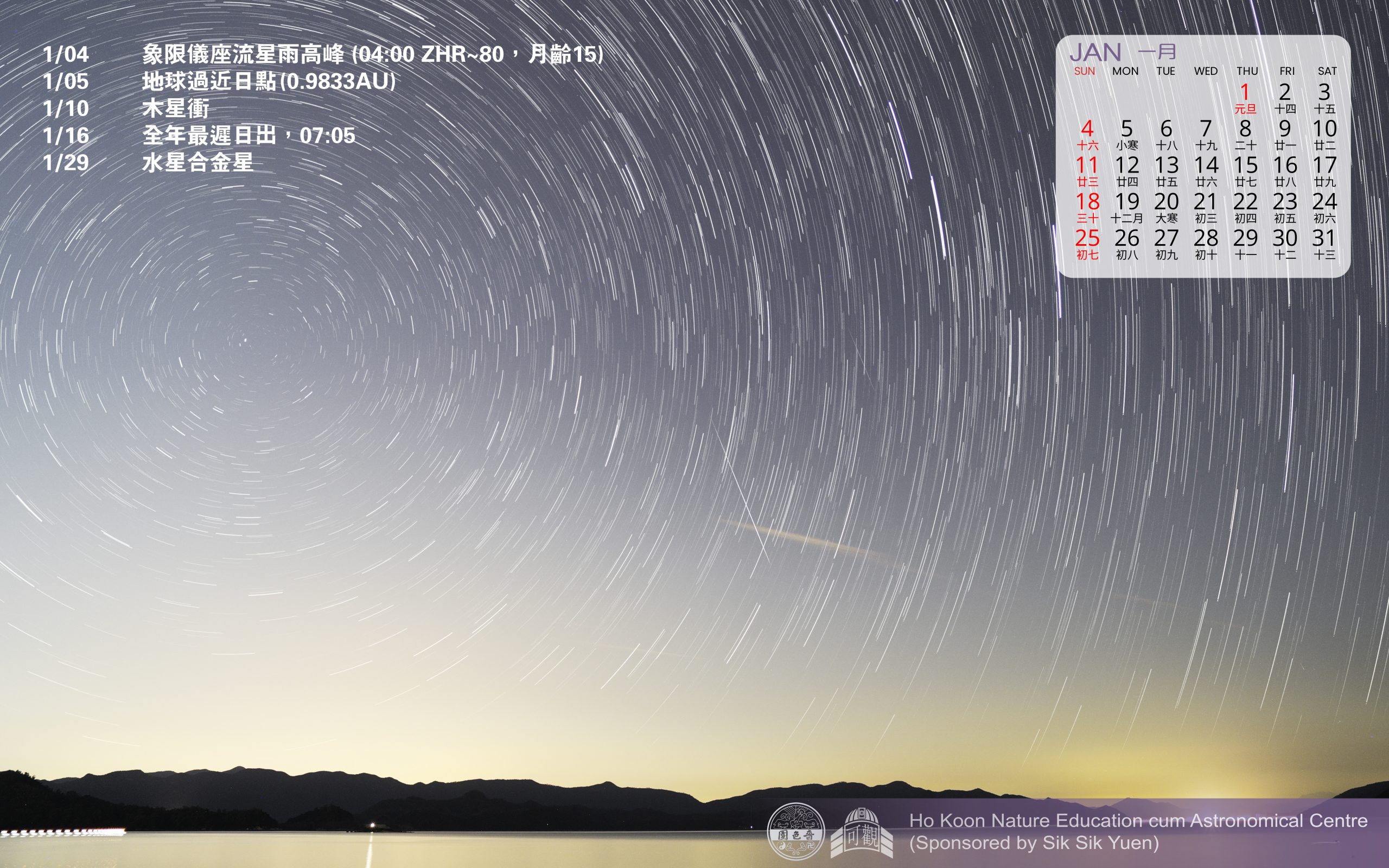 天文壁紙2026 每月推出 歡迎下載使用 流星雨×拱極星流跡 1月天象推介 1月4日 象限儀座流星雨高峰,04:00,ZHR~80,月齡15 1月5日 地球過近日點,01:16,距離0.9833 AU 1月10日 木星衝,16:42,位於雙子座,視直徑約47”,約-2.7等 1月16日 全年最遲日出,07:05 1月29日 水星合金星,日落後於西方低於5°,距約0.7° http://www.hokoon.edu.hk/ast/stargaze/2026skyevents/ 天象時間以香港標準時間HKT(UTC+8)標示,詳情可參考香港天文台 授時服務 及 教育資源。 相關消息 天文壁紙2025資源庫2025 年 12 月 1 日 天文壁紙2024資源庫2024 年 11 月 30 日 天文壁紙2023資源庫2023 年 11 月 30 日 可觀Channel資源庫2022 年 6 月 9 日 2026精選天象一覽天文現象2025 年 12 月 29 日 大磡有邊三寶?博物特寫2025 年 12 月 29 日 第一屆幼兒自然生態速查大賽 2026初階環境教育課程,比賽2025 年 12 月 16 日 路邊的野菊博物特寫2025 年 12 月 15 日 雙子座流星雨 Geminids天文現象2025 年 12 月 5 日 跟着專家去探索自然2026專題計劃2025 年 12 月 4 日