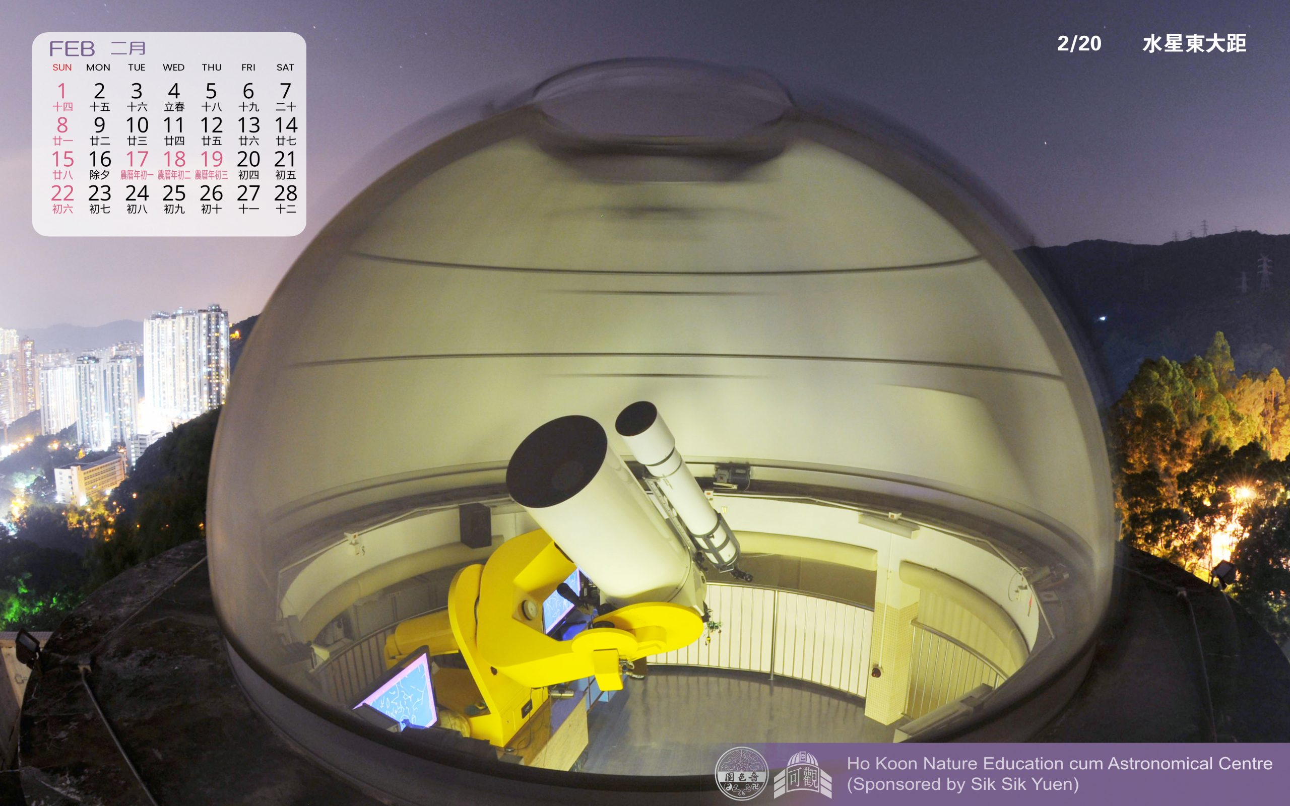 天文壁紙2026 每月推出 歡迎下載使用 可觀0.5米望遠鏡 2月天象推介 2月20日 水星東大距 日落後於西方低空,距太陽18.1°,約-0.5等 流星雨×拱極星流跡 1月天象推介 1月4日 象限儀座流星雨高峰,04:00,ZHR~80,月齡15 1月5日 地球過近日點,01:16,距離0.9833 AU 1月10日 木星衝,16:42,位於雙子座,視直徑約47”,約-2.7等 1月16日 全年最遲日出,07:05 1月29日 水星合金星,日落後於西方低於5°,距約0.7° http://www.hokoon.edu.hk/ast/stargaze/2026skyevents/ 天象時間以香港標準時間HKT(UTC+8)標示,詳情可參考香港天文台 授時服務 及 教育資源。 相關消息 天文壁紙2025資源庫2025 年 12 月 1 日 天文壁紙2024資源庫2024 年 11 月 30 日 天文壁紙2023資源庫2023 年 11 月 30 日 可觀Channel資源庫2022 年 6 月 9 日 天文觀星樂 -告別大鏡X木星之夜 (2/12&13)天文館活動2026 年 2 月 9 日 不一樣的小犬博物特寫2026 年 2 月 9 日 天氣觀測專題探究比賽 2026 —— 微氣候與市民的生活比賽2026 年 2 月 4 日 預言家請開眼:人工智能在自然災害監察及預警上的應用博物特寫2026 年 1 月 29 日 嗇色園105周年紀慶走過自然天地2026 第七屆全港小學生物速查「100」比賽2026 年 1 月 16 日 「落紅不是無情物,化作春泥更護花」:落葉膠囊博物特寫2026 年 1 月 12 日