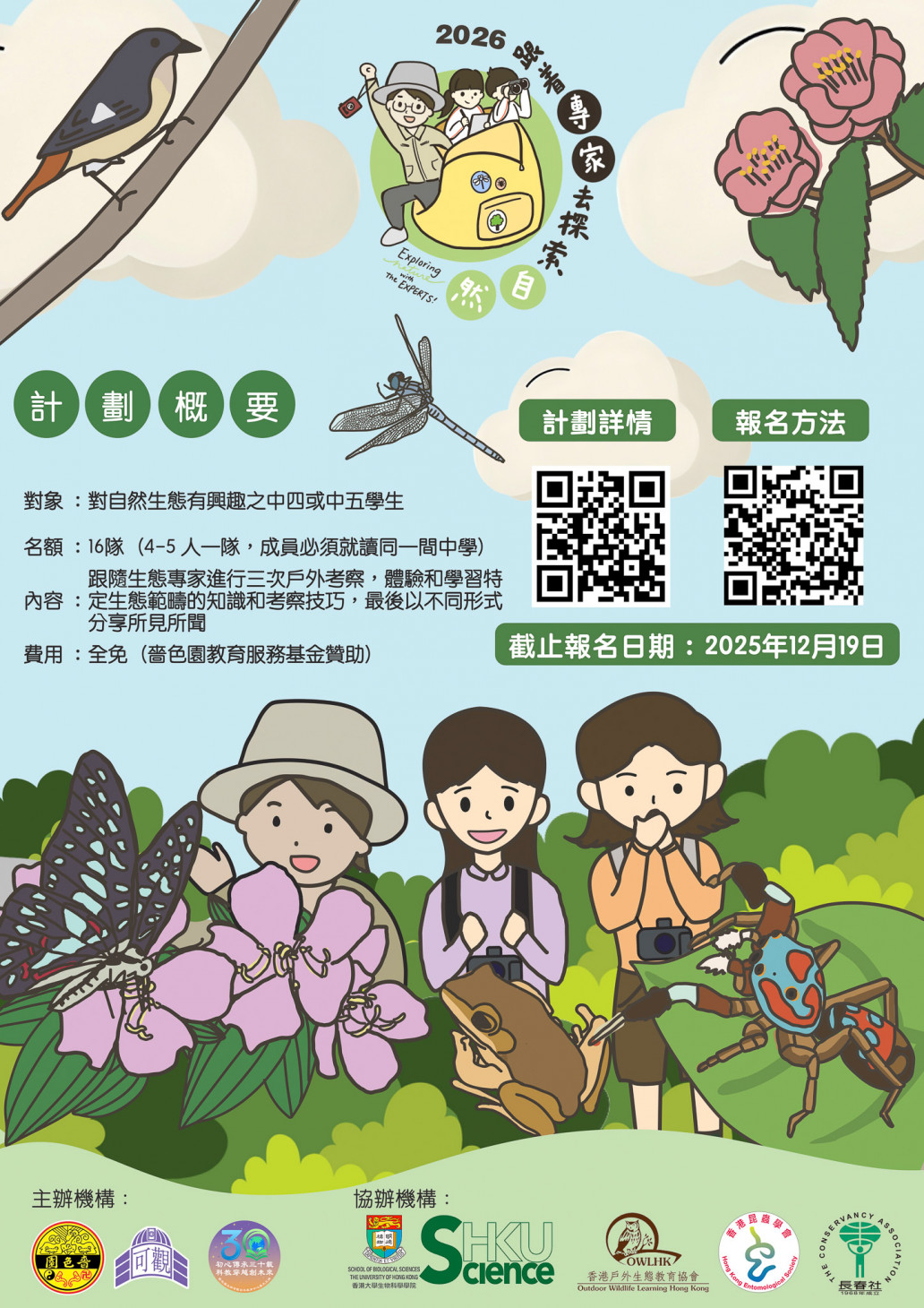 天氣觀測專題探究比賽 2025 —— 社區微氣候觀測 走過自然天地2025 第六屆全港小學生物速查「100」 跟着專家去探索自然2025 「天氣與氣候」問答遊戲比賽及短影片創作比賽2024 走過自然天地2024 第五屆全港小學生物速查「100」 顯微成像科技學習中心 「天氣與氣候」問答遊戲比賽及資訊圖設計比賽2023 「天氣與氣候」網上問答遊戲比賽2022 嗇色園100周年紀慶「用心看!」攝影及短片創作比賽 地理電子學習教材套:氣候變化 AEON智能環保家居計劃