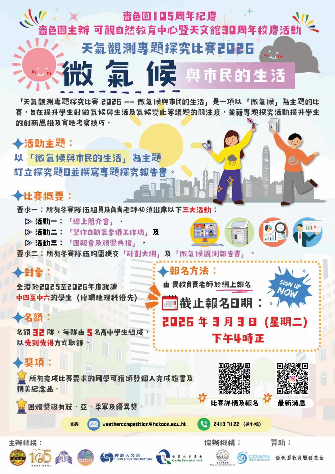 「天氣觀測專題探究比賽 2026 —— 微氣候與市民的生活」由嗇色園主辦可觀自然教育中心暨天文館及香港天文台主辦,香港氣象學會及社區天氣資訊網絡協辦,並配合優質教育基金「電子學習配套計劃」之《地理電子學習教材套:氣候變化》2.0 版項目,是一項全港性的天氣觀測專題探究比賽。比賽現正接受報名!