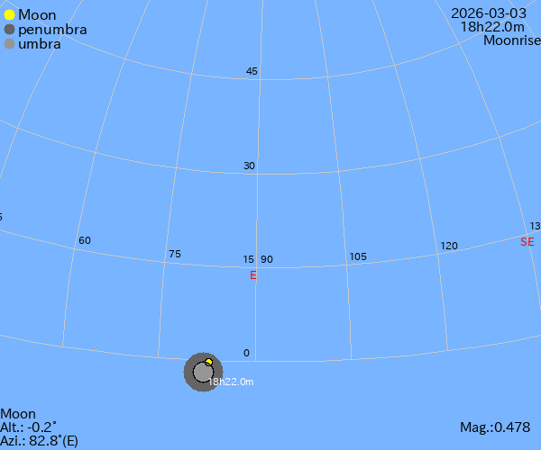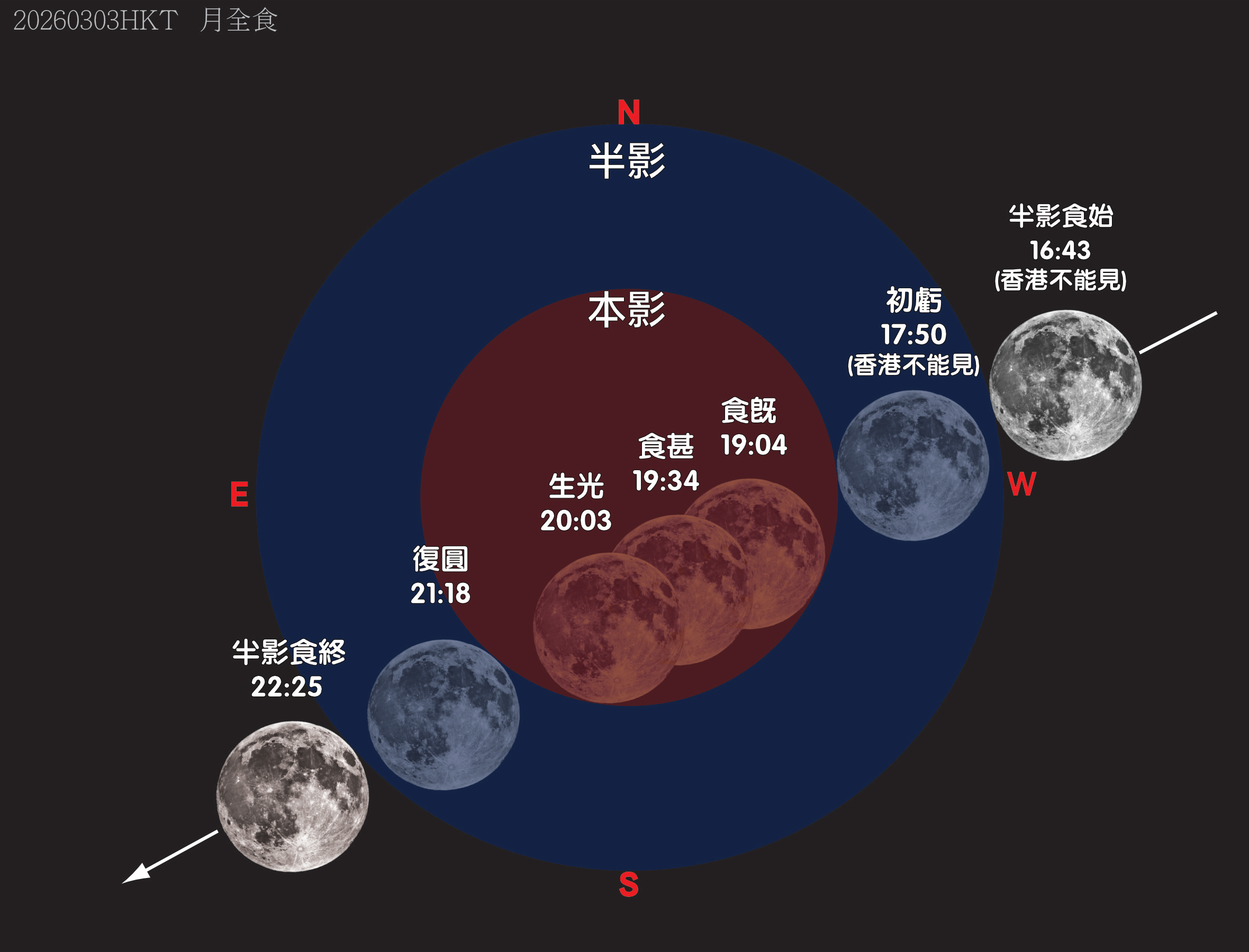 本次月食將於3月3日傍晚發生,月食由香港時間 (HKT/UTC+8) 3月3日 16:43開始,本港可以觀測到18:22月出後的過程,向東方近地平無遮擋的地方能以肉眼觀看。全食期間,月球將呈現暗紅色。初虧至食既期間會從地平升出,觀測可能因地形及建築物遮擋。月出時尚未日落,天色較亮亦會影響觀賞效果。是次月食正值農曆丙午年正月十五 元宵節,而2月17日 正月初一則發生日環食,但只有南極洲及南極海部分地區可見。