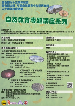 可觀自然教育中心暨天文館一直於學界以推動環境教育為己任,推陳出新設計課程及活動以配合學界所需。適逢嗇色園九十五周年紀慶及本中心二十周年校慶,本中心誠意邀請多名本港著名自然科學相關專家,以一系列自然教育專題講座,為學界及公眾人士帶來一場又一場的思想盛宴。